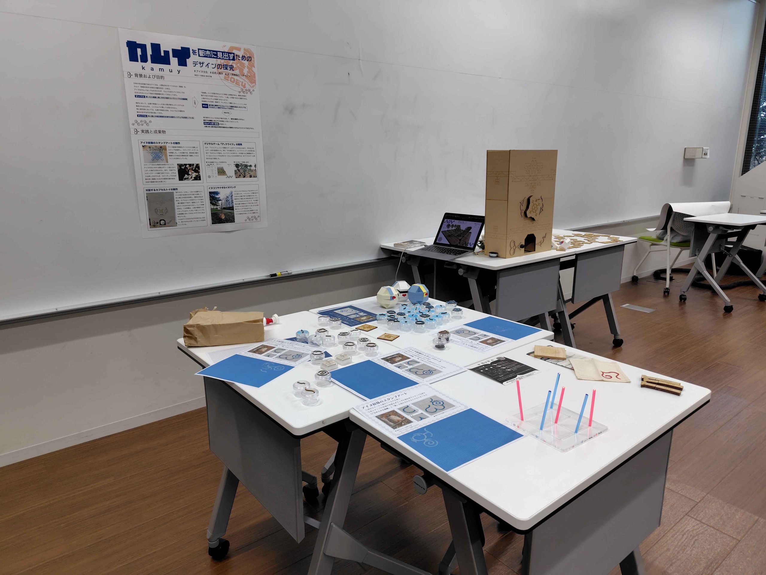 3 月:プンカㇻ(アイヌ文化でつながる博物館等ネットワーク)、4 月:人生の大切なことをゲームから学ぶ展、5 月:国立民族学博物館、リサーチカンファレンス、日本民藝館、6 月:ウポポイ民族共生象徴空間、日本文化人類学会、9 月:釧路市立博物館、釧路なつかし館、映画『シサム』、10 月:デザインフォーラム『デザインと人類学の「目」』、「 から へ。展」、11 月:日本デザイン学会、ICHIGAYA INNOVATION DAYSが主な展示であり、デザインと文化人類学の内容を中心に、アイヌ文化へのデザイン的アプローチを考える切り口の調査を行なった結果、デザインと文化人類学の考え方の違いが見えてきた。