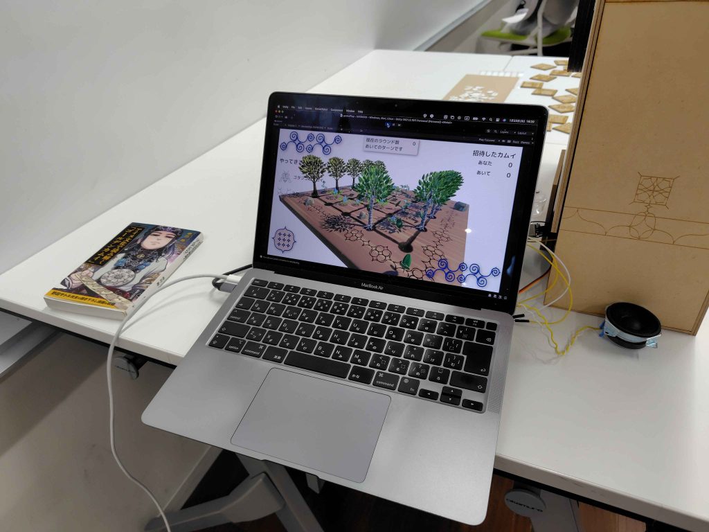 これまでデジタルゲームから学びに繋がる経験を多くしてきたことから、メディアの中でも特に伝播する力が強いメディアであると考えられる。ゆえにカムイを都市に見出す働きの一環としてデジタルゲーム『アㇱケウイナ』の開発を行なった。元々、『ウコニアㇱ』という陣取りゲーム[2]がアイヌ文化にはあり、それを土台にゲーム性の拡張をした。特に「木を植え合う」というウコニアㇱの本来の由来や「木のカムイが座る」というアイヌの考え方、木を植えると動植物がやってくるというシンプルな考え方(カムイたちを招待する)をデジタルゲーム特有の方法で表現した。アㇱケウイナは「(複数を)招待する」という意味[1]である。