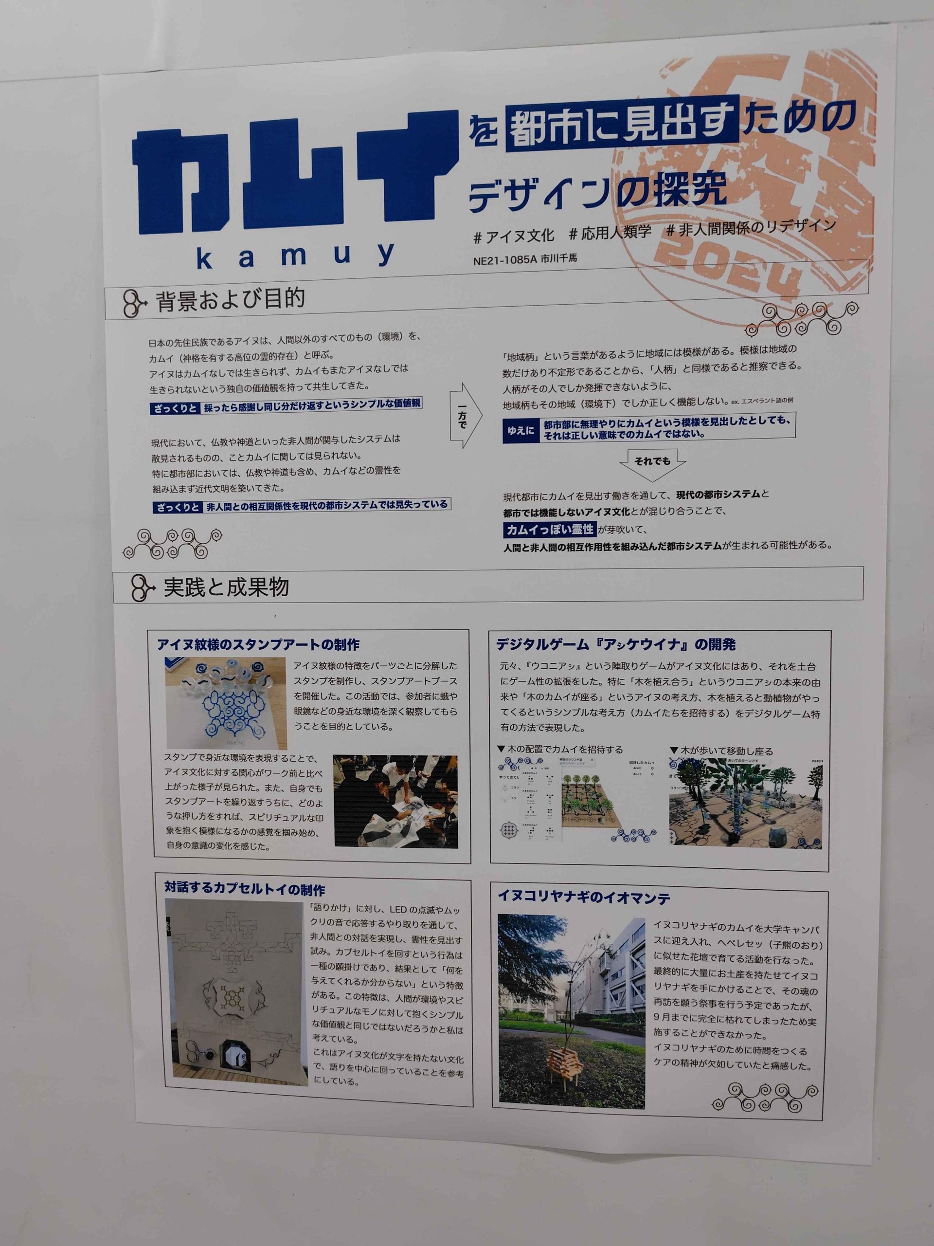 本研究は、応用人類学の考え方を参考に、アイヌ文化を背景にしたギミックの開発/設置等を通して、カムイを都市に見出すためのデザインの探求を行う。そして、我々が近代化の中で見失った環境との相互作用性や霊性を、現代の都市の中で再構築していくとともに、アイヌでない我々が都市部にカムイを見出すことの意義を探究する。