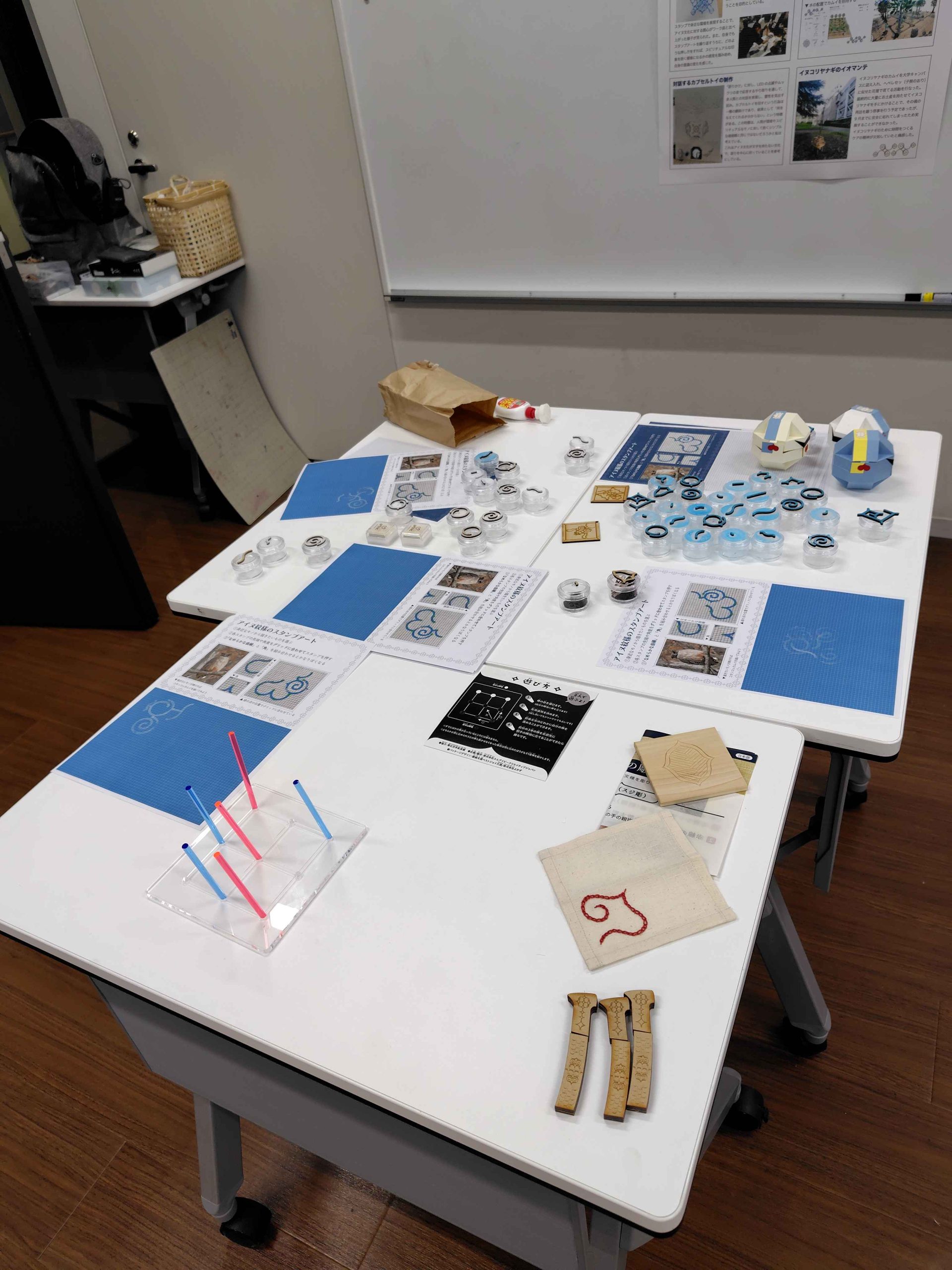 6 月までの調査を踏まえ、まずはアイヌ紋様の特徴をパーツごとに分解したスタンプを制作し、スタンプアートブースを開催した。この活動では、参加者に蛾や眼鏡などの身近な環境を深く観察してもらうことを目的としている。結果として、スタンプで身近な環境を表現することで、アイヌ文化に対する関心がワーク前と比べ上がった様子が見られた。また、自身でもスタンプアートを繰り返すうちに、アイヌ紋様のビジュアル的特徴からどのような押し方をすれば、スピリチュアルな印象を抱く模様になるかの感覚を掴み始め、自身の意識の変化を感じた。