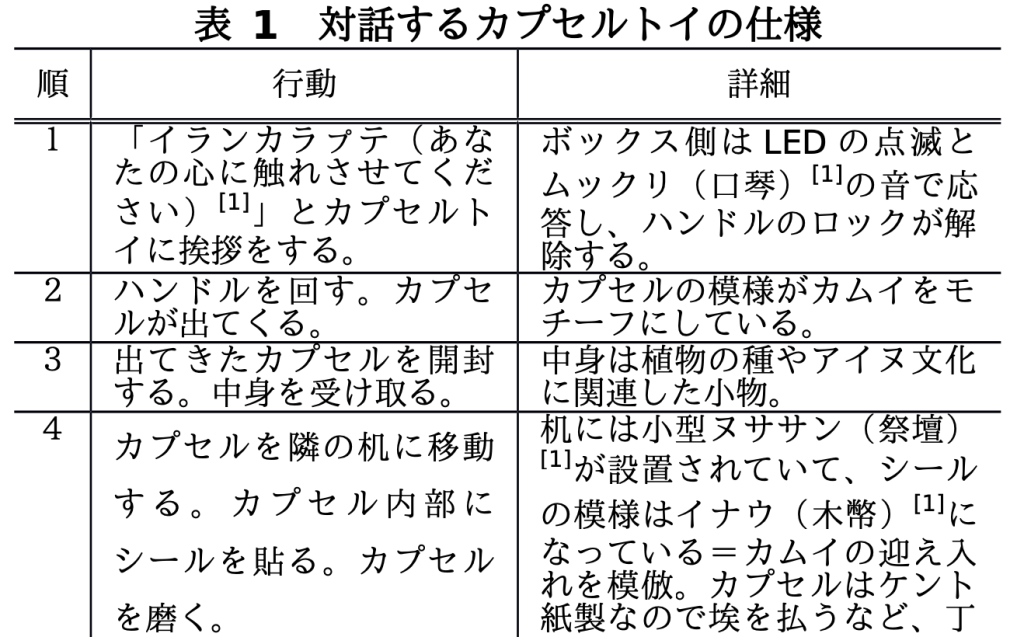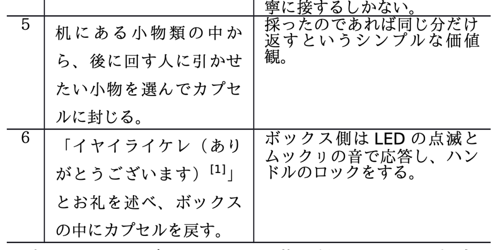 一般的に、カプセルトイを回すという行為は一種の願掛けであり、結果として「何を与えてくれるか分からない」という特徴がある。この特徴は、人間が環境やスピリチュアルなモノに対して抱くシンプルな価値観と同じではないだろうかと私は考えている。ゆえに、カプセルトイの一連の動作に「語りかけ」という行為を加えることで霊性を見出そうと試みた。これはアイヌ文化が文字を持たない文化で、語りを中心に回っていることを参考にしている。