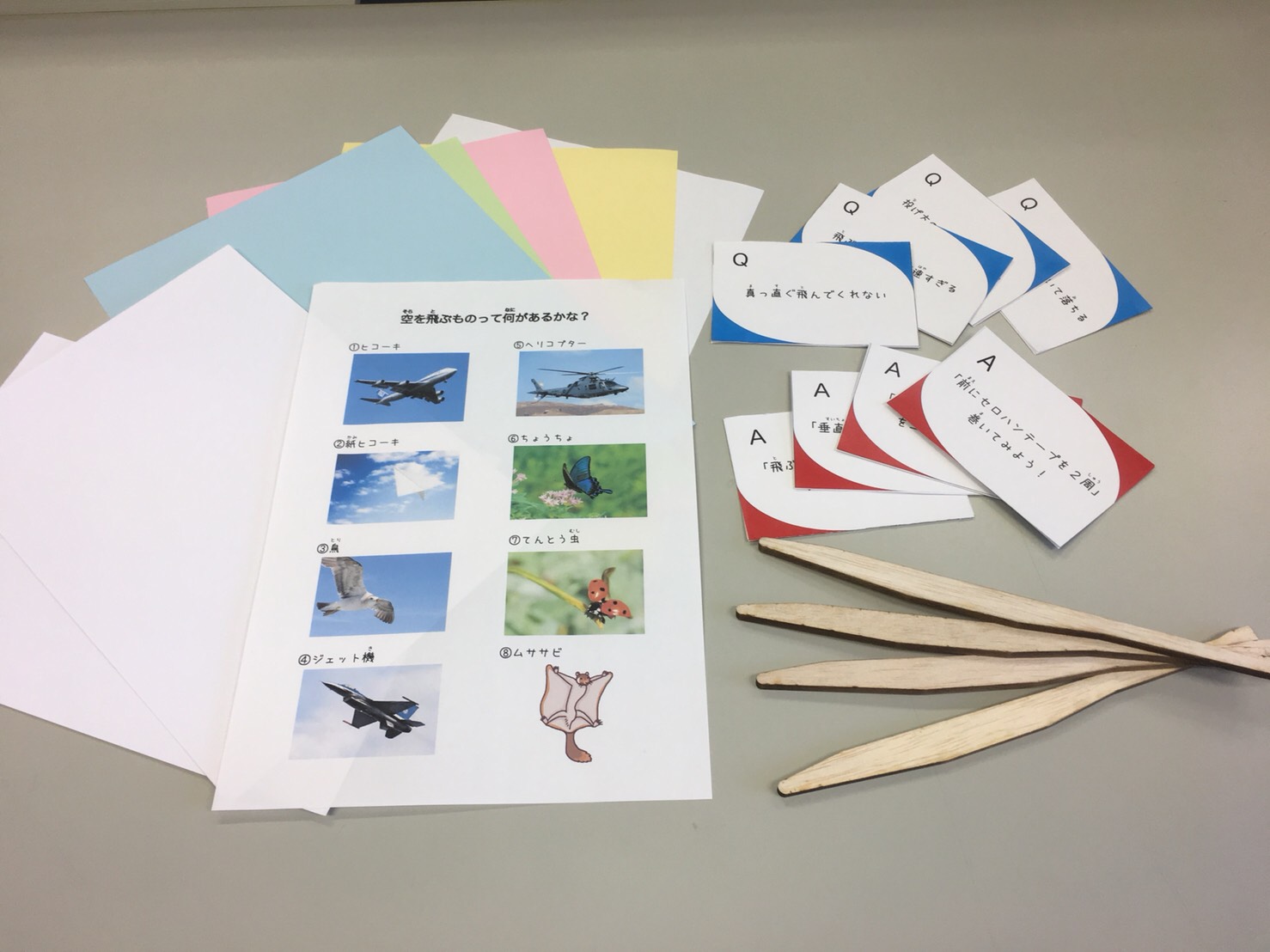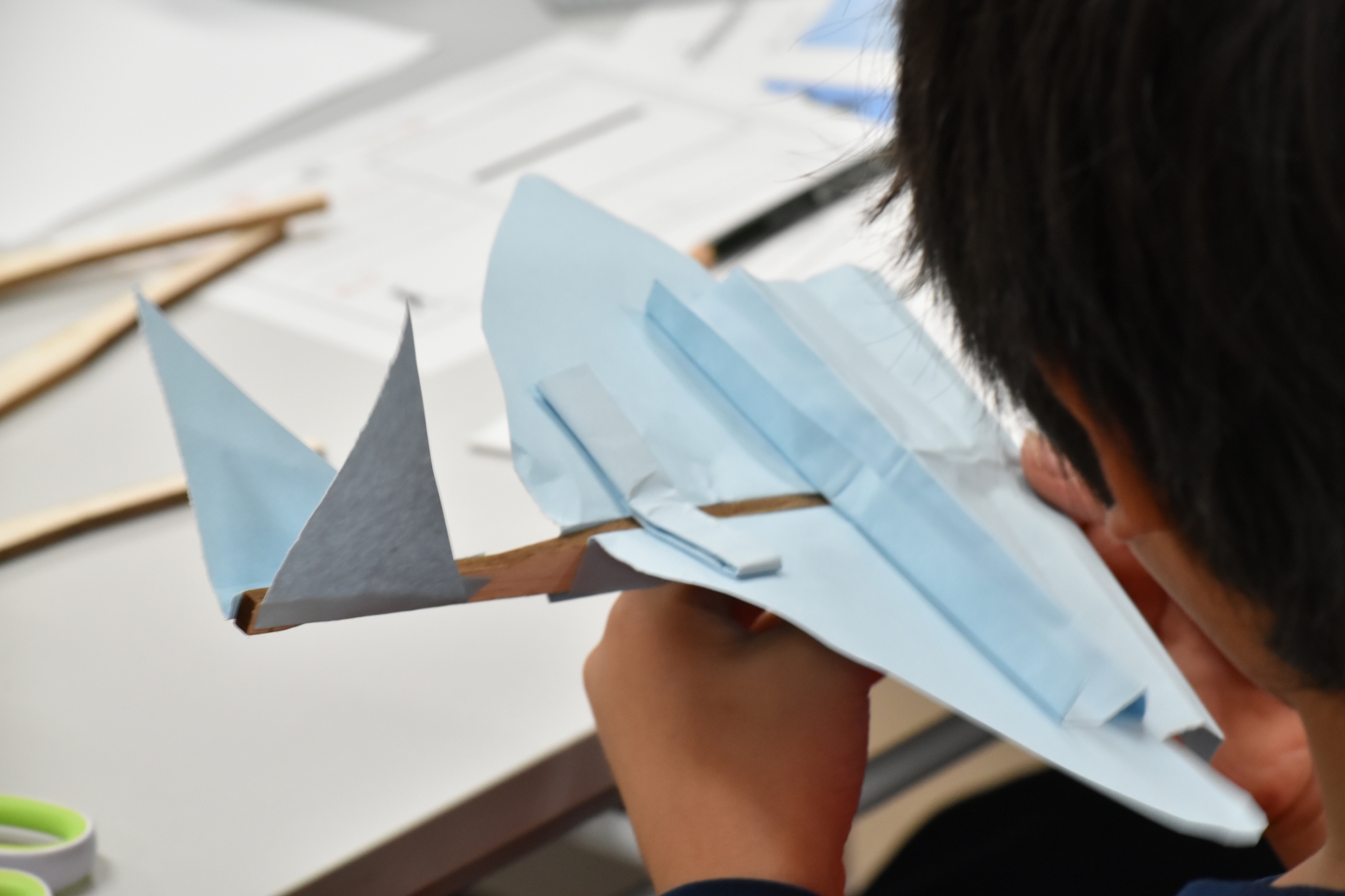 機体の軸としてバルサ材(木材)、翼として普通紙と厚紙を事前に用意し、「飛ぶ機体」を作る事だけを目標として、全体90分の内、60分以上を自由制作に費やした。