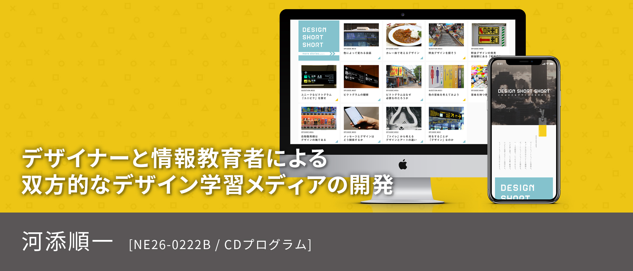 「デザイナーによるデザインの知識や思考、発見などをウェブを通して教育者に対して広く共有するメディア」を目指し「DESIGN SHORT SHORT」を開発した。このメディアでは、メッセージやトイレ、ピクトグラムといった私たちの身近にあり、高校生向けの情報教育に利用することができるものにスポットを当て、デザイナーが発見した身近なものに潜むデザインをショートショート小説のように読みやすいコンパクトな記事を公開し、それら記事を基にしたデザイナーから教育者に対する問いかけを行った。この記事と問いかけ、そしてそれに対する解答を行うことでデザイナーと教育者の双方的なメディアとなることを狙った。