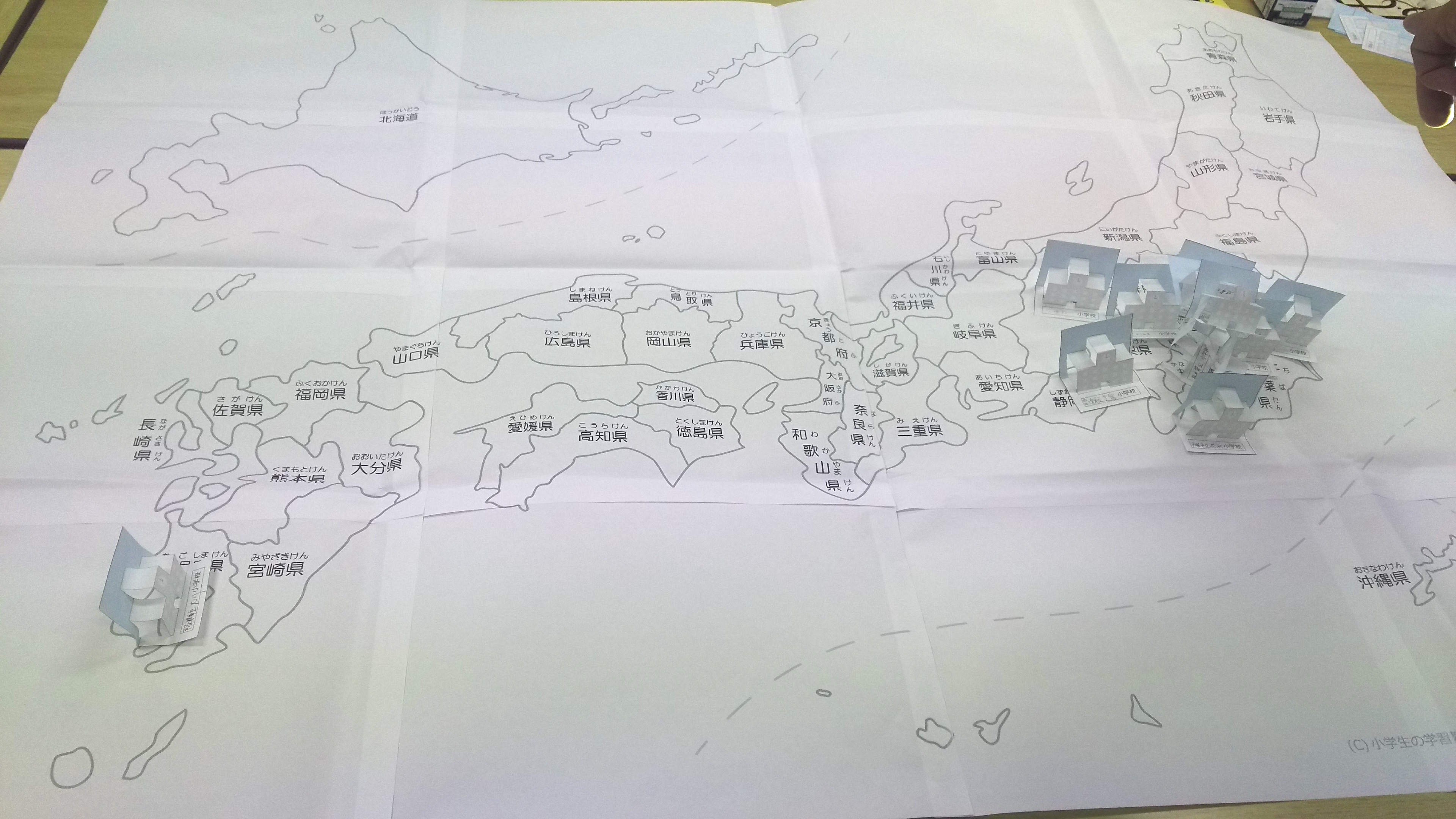 日本地図の上に、自分が通った小学校の名前を記した立体物を乗せる。母校を思い出すことや、他の人がどこの小学校に通っていたか知ることで会話が生まれる。