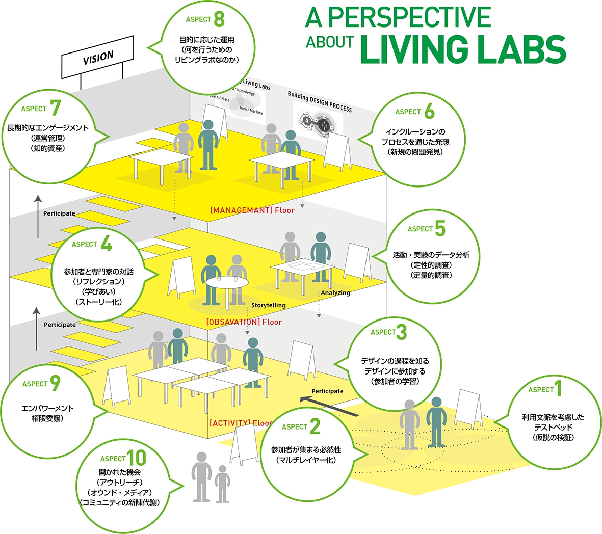 文献[1]を参考に、一枚の紙に切り込みを入れるだけで立体化することができるか5点の試作を行った。また、複雑な概念図の事例として教員の研究である「LIVING LAB」のインフォグラフィックスを立体化した。
