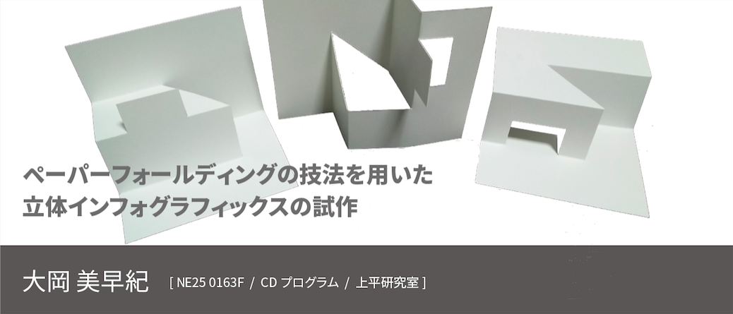 アルバースは紙が生み出す構造の審美性に着目していたが、シンプルな紙を組み立てることには別の側面もあると考えられる。私の研究は、ペーパーフォールディングという方法を用いて、3次元的な視点のグラフィックスを空間化することで、情報の理解を支援できないか、という点に着目する。