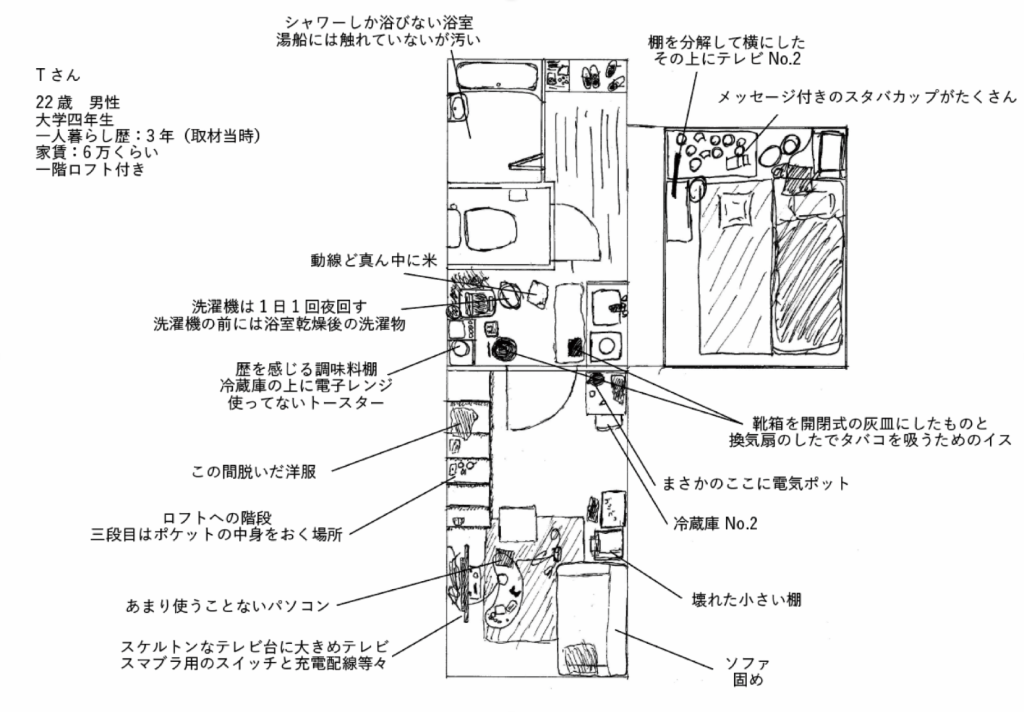 人々が快適な空間を構築する能力を調査するために、都築響一著『TOKYO STYLE』[8]の手法を参考に、実際の居住空間を訪問・宿泊し、空間の構成を描き起こして記録した。(図 1)この調査により、利用者が自らのニーズに応じて空間をデザインしている実例を数多く収集することができた。記録した空間の多くは、機能性と個人の趣味嗜好が融合したものであり、快適さを追求する営巣本能の一端を垣間見ることができた。