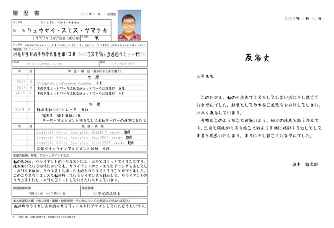 今回制作したフォントは英字・数字・ひらがな・カタカナのみ収録していて、漢字は含まれていない。これでは、普段使いするフォントとしては不十分であると考える。なので、漢字のみを他のフォントから拝借し、普段使いするイメージを掴みやすくするために、履歴書と反省文を制作した。以下(図3)は制作した作品である。組み合わせたフォントは『櫻井幸一フォント』である。