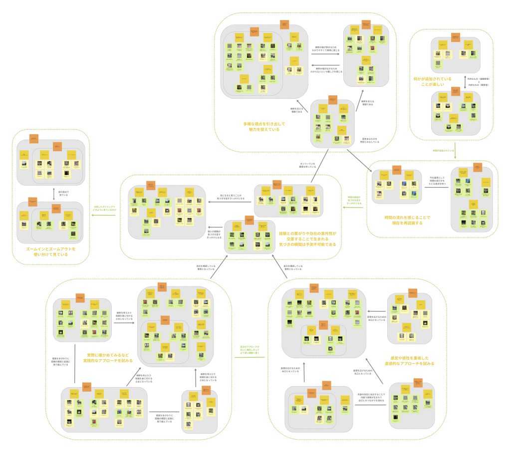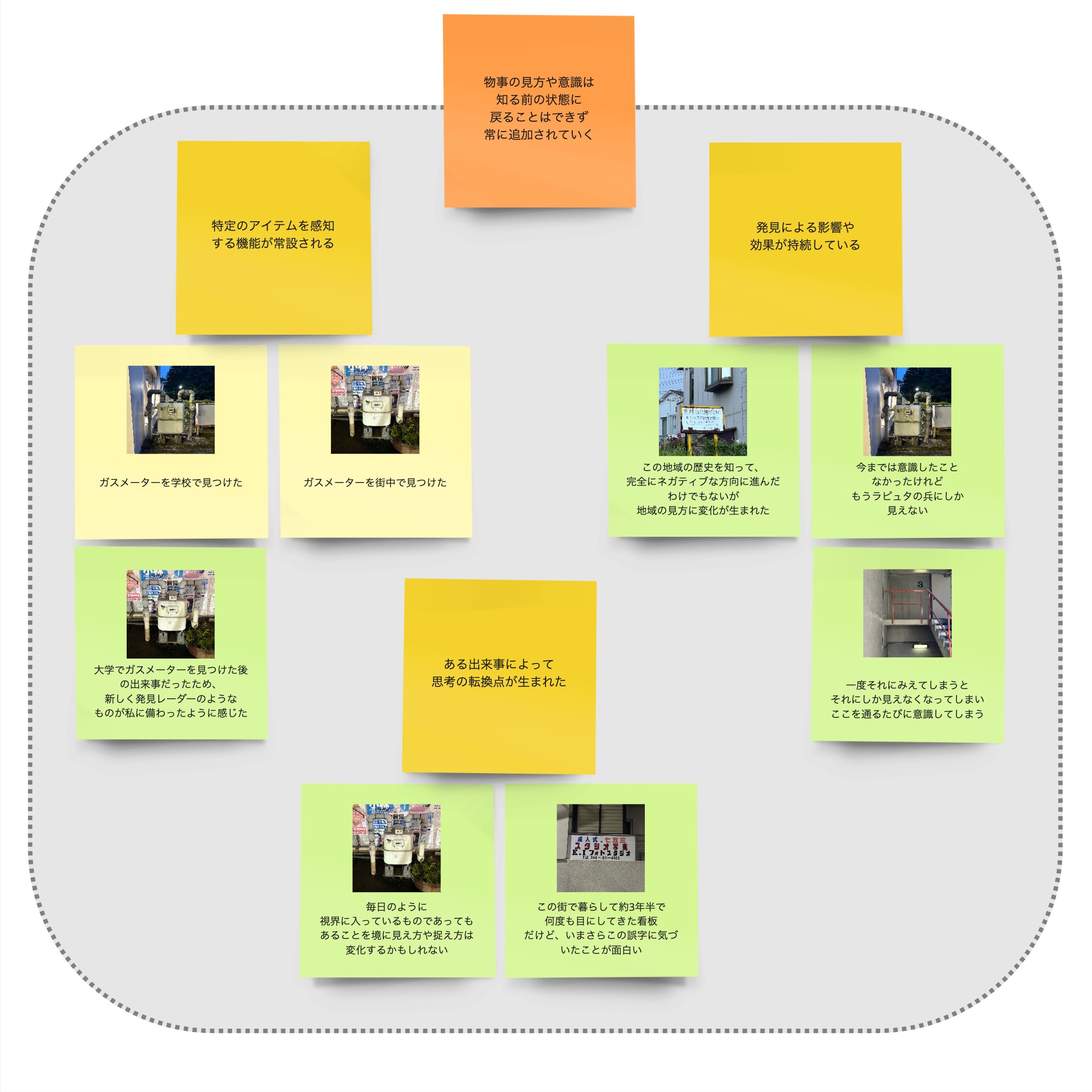 まず、今までの街中観察で見つけた発見を一覧できるよう、記録として残すために撮影した写真と説明文を観察記録として集めて並べた。次に、観察記録から得られた情報を事実と解釈に分けて異なる色のカードに書き出す。全てのカードを眺めながら、意味や文脈が近いもの同士を集めてグループ編成を行う。グループの内容を示すラベルを作成した。さらに、グループの配置場所によって関連性の強度を表現して、関連性を線や矢印で示しながら、つながりを文章で補足した。