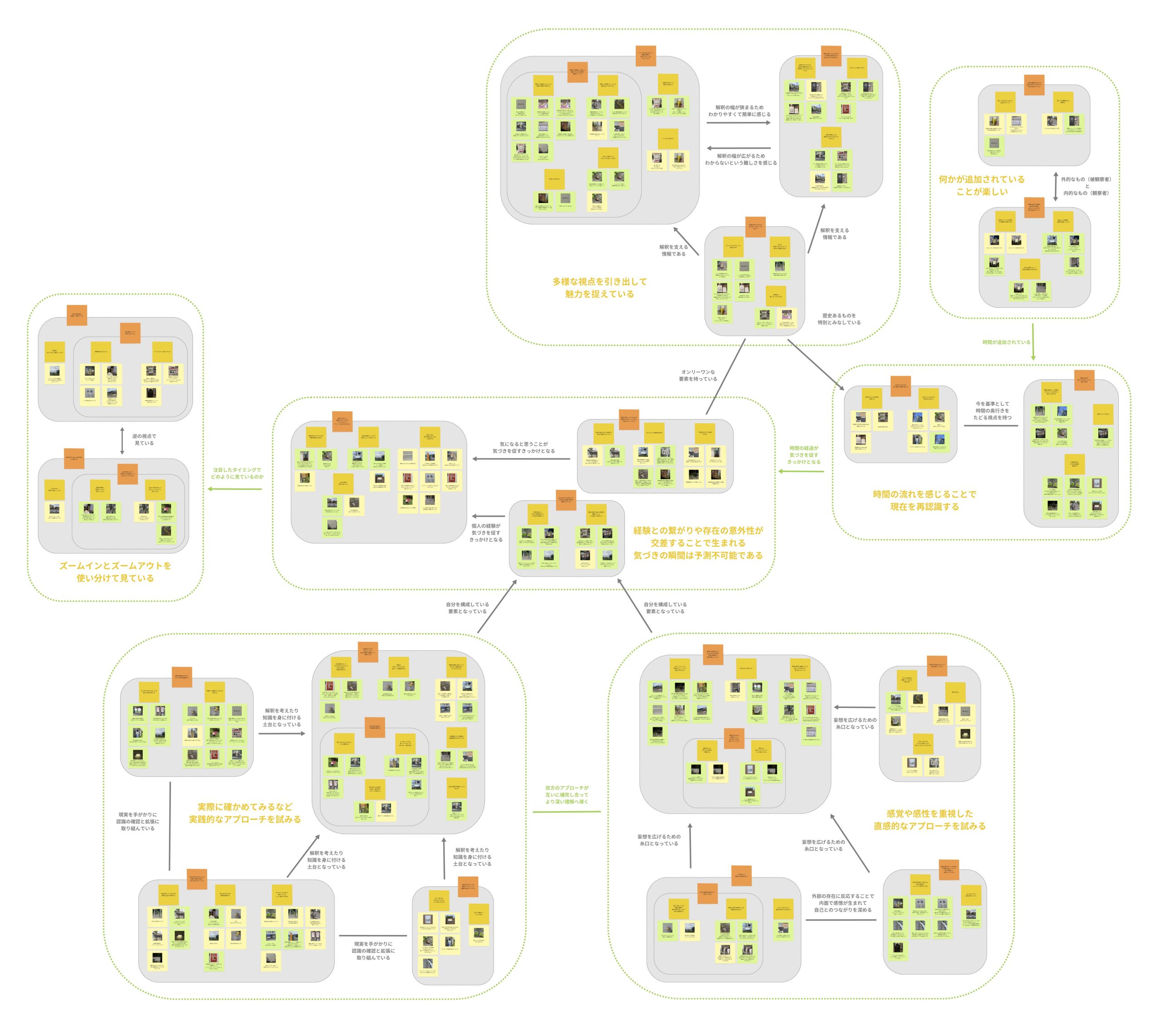 これまでの観察記録をもとに KJ 法を用いて記録を整理し、路上や街中で観察できる面白いものについての解像度を高める分析を行った。分析の過程において、それぞれの記録同士につながりを見出し、探索的な視点が生まれる場面や瞬間を親和図として可視化させた(図 1)。これまでの記録を振り返ると、観察の対象や場所などはバラバラで統一性は少ないように感じられた。しかし、このような断片的な情報から理解を深めていくためにはKJ 法が最適であると考えた。