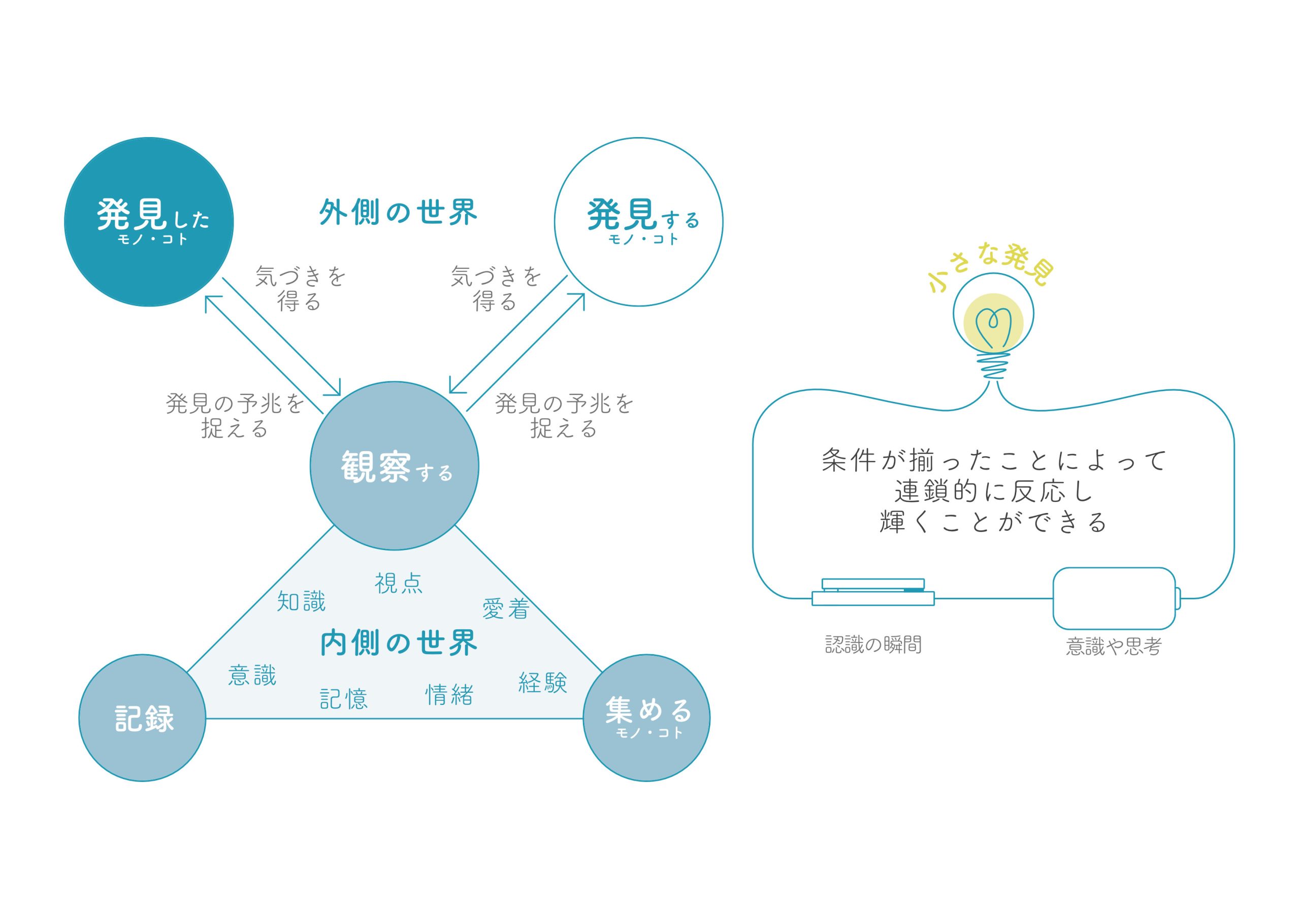 制作した親和図から、路上や街中で観察できる面白いものとは、純粋にモノが存在することだけでなく、それまで見えなかったつながりの存在に気づくことだと考えた。小さな発見は、認識の瞬間とその時の意識や思考などの条件が揃うことで連鎖的に生まれる。また、観察する行為は、現実世界という外側と、自分自身のまなざしや身体という内側との橋渡しの役割を担っている。このように、つながりの連続性と循環に気づき、それらを自分のこととして捉えることが、豊かな日々への第一歩となるのだと考える。
