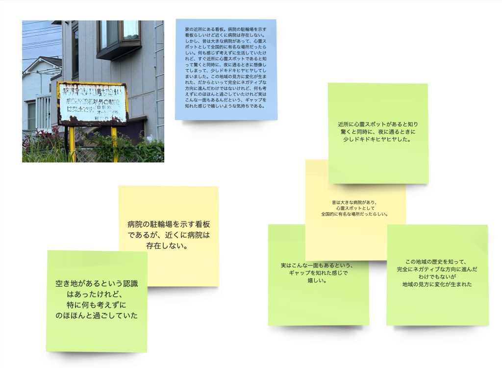 前期に実践した街中観察の成果として、家の近所で発見した古い看板をあげる。看板の色褪せた文字を解読したところ、とある病院の駐輪場であることを示す看板であった。しかし、周囲に病院は見当たらない。そこで、地域について調べると、過去に大きな総合病院が存在していたことが判明し、心霊スポットとしても有名であることがわかった。この経験から、これまでは何も思わずに近くを歩いていたにもかかわらず、深夜に病院の跡地付近を通るときに緊張するようになった。