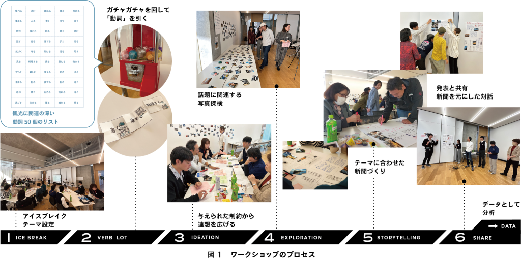 各グループは,さらに観光体験に関係の深い「動詞」3 つを設定し,⼩テーマを定める。ここでガチャガチャを回して出てくるカプセルに「動詞」が封入されており,50 の動詞の中から無作為な組み合わせを発生させるという強制発想法を取り入れた。この仕掛けは 2 つの狙いを持つ。ひとつめは,偶発的に与えられるルールに則って遊ぶことで,〈ともに考える楽しさ〉を生み出すためである。ふたつめは,固定観念に縛られがちな観光体験をガチャガチャの〈無作為性によって撹拌〉し,思いがけない切り口から発想を引き出すためである。