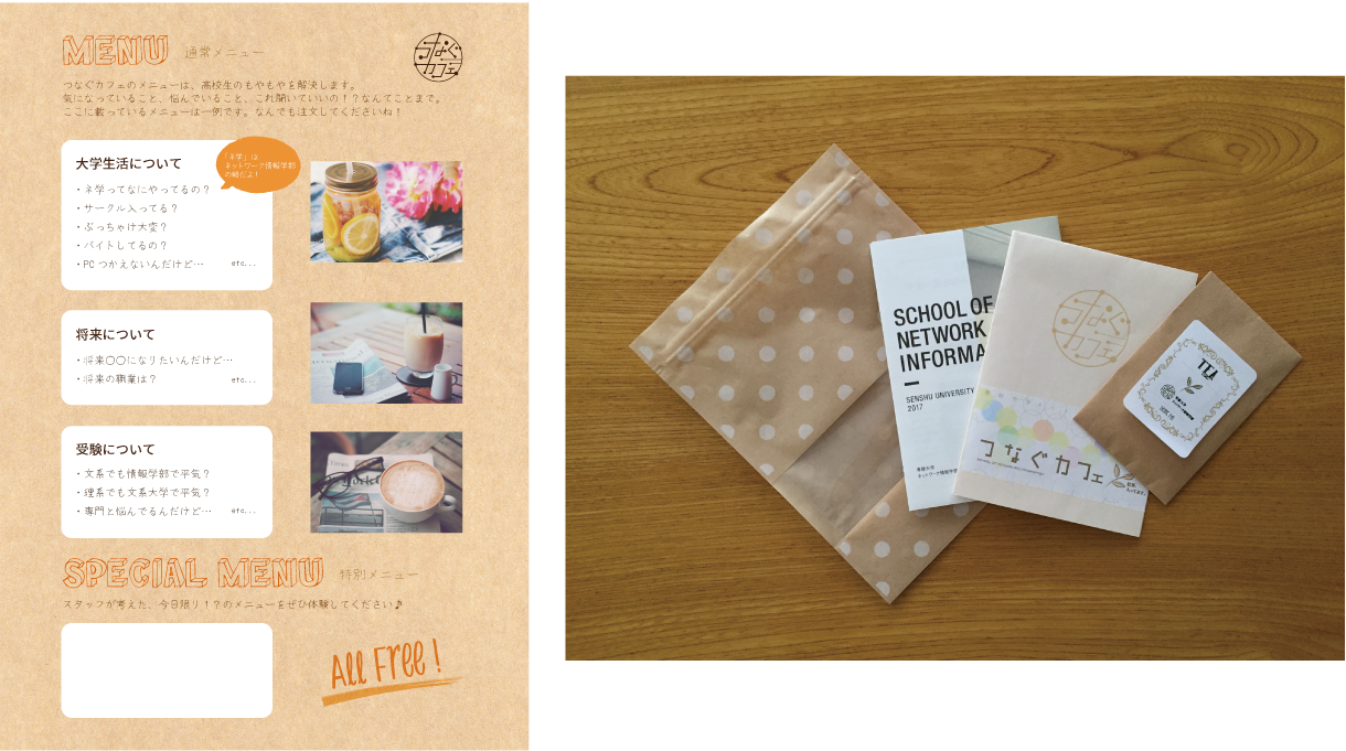また、つなぐカフェやネットワーク情報学部への招待状を制作し、つなぐカフェの開催日に高校生へ配布した。さらに、ネットワーク情報学部の提携高校宛に招待状を送付し、高校生に配布していただいた。