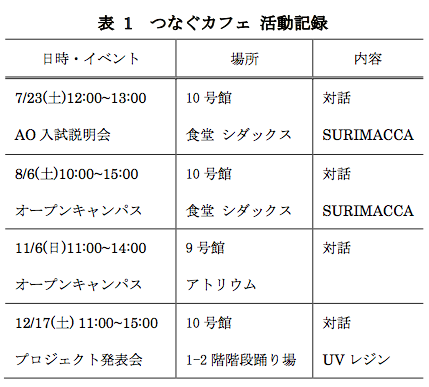 オープンキャンパスなどのイベントに合わせて学内で「つなぐカフェ」というポップアップカフェを開催し(表1)、高校生と大学生がコミュニケーションをとる場を設けた。はじめに、ものづくり体験を通じてその楽しさに触れてもらい、そこから対話を通して高校生が抱える悩みの解決に協力し、本学部に興味を持つきっかけをつくった。