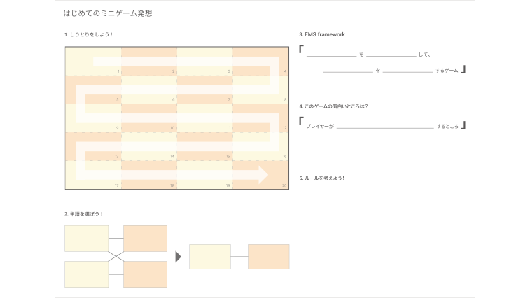 本研究で提案するアイデア発想法は以下の通りである. 1. 2人1組を作る. 2. しりとりを行い20単語分続ける. この時創作物に関する固有名詞の利用を禁止とする. 3.でた単語から奇数番目の単語を二つ、偶数番目の単語を2つ取り出す. 4. 取り出した単語のうち奇数番目と偶数番目の単語の組み合わせを用いてE M Sフレームワークを穴埋めする. 5.出来上がったフレームワークからプレイヤーにとってどういったところが面白いのか考え「プレイヤーが〇〇するところ」という文章を穴埋めする. 6.最後に穴埋めした文章をもとにルールや仕様を考えシートに記入する. また、ワークショップではうまくアイデアが出ない組のために動詞が出てくるガチャガチャを用意しランダムに単語を与えアイデア発想の補助も行う.