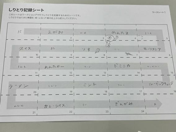 A3タイプのワークシートの制作を行なったまたこのA3タイプのワークシートを研究室内の大学生7人に協力してもらい実際の使い心地を検証した. 検証の結果しりとりの単語選択方法に偏りが生まれてしまうことと、その後のフレームワークからルールを考える工程が難しいとわかったため、改良を加えたものを今回の研究の成果物とした.