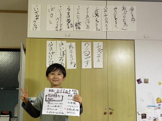 お家居酒屋では、食事という日常の生活を特別にするというコンセプトで協働する事を図った。外食でも良いが時世を鑑み、自宅を居酒屋風に飾りつけたり、メニューを作ったりして自分たちオリジナルの空間作りをみんなで行った。それぞれに役割を割り当てることで全員が店員でお客さんであるような空間を作る事ができた。それぞれが制作した立札やメニュー、料理などが会話のタネになった。また、家族全員が揃って食事をするという事も少なくなっていたため一緒に食事をするということの大切さも再確認する事ができた。