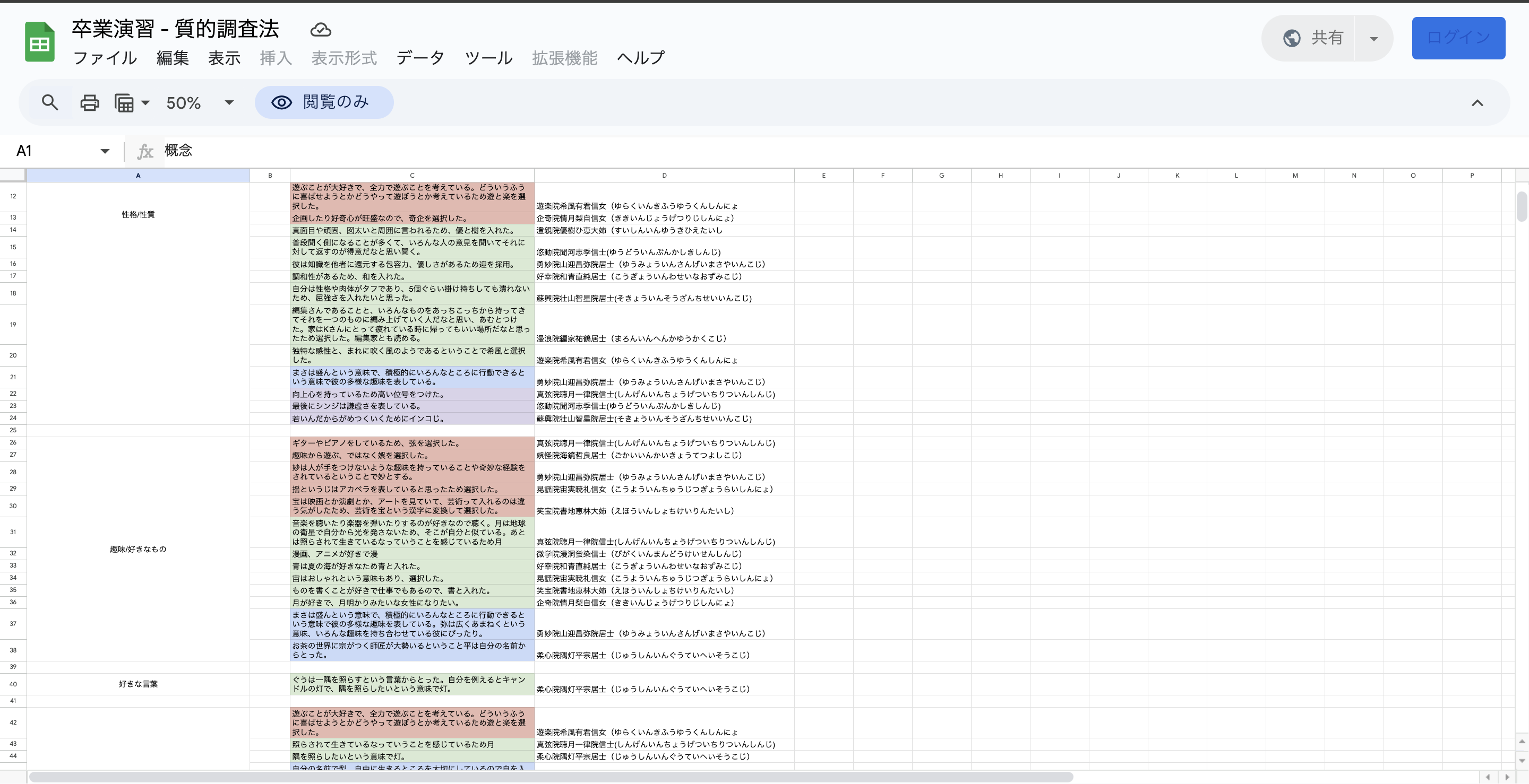 当研究では、質的調査法を用いて分析を行なった。具体的には、ワークショップ内で録音した音声を googleスプレッドシートに書き起こし、参加者の発話を分析した。