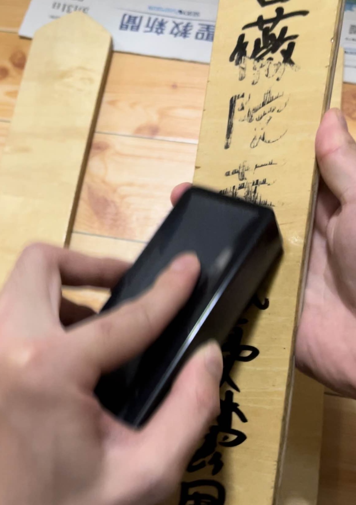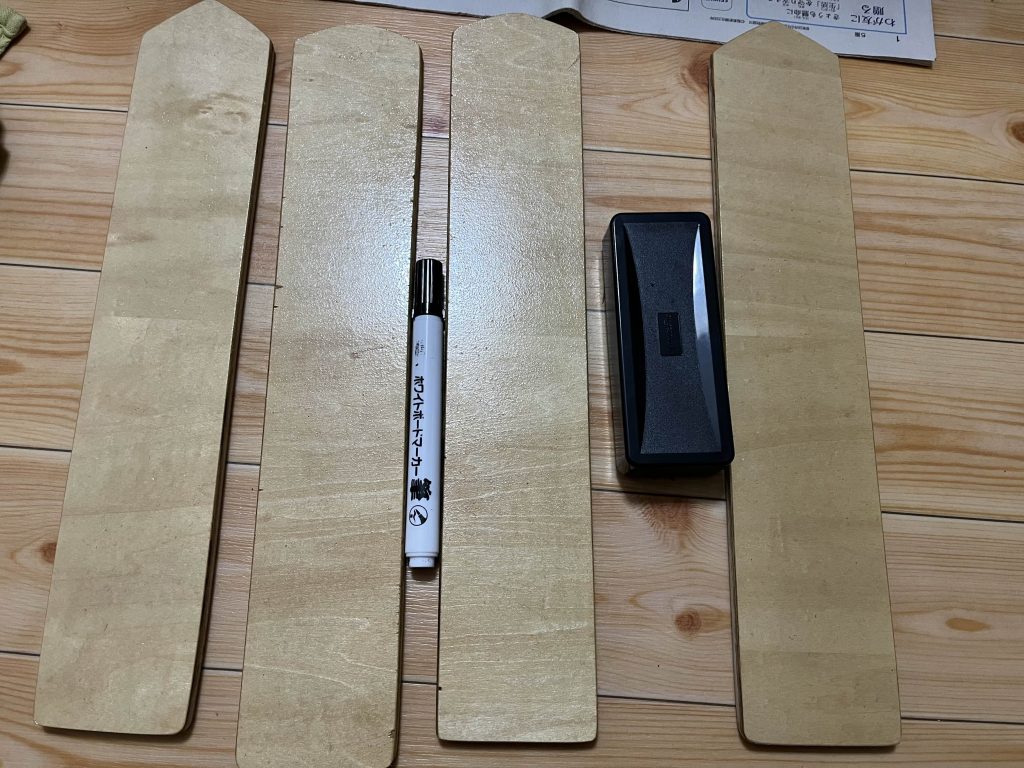そこで、戒名を考えるための対話ツールキットとしてreleca を制作した(図 1)。releca は木板とホワイトボードマーカー、ホワイトボードイレイザーを含んだキットになっている。木板はホワイトボードのように使用することができるため、木板上に書いた文字はイレイザーで消すことができる。さらに、ホワイトボードマーカーとして筆ペンを採用した。
